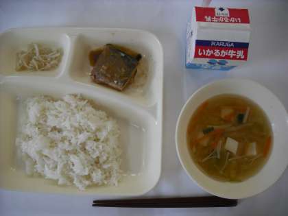 「さばのみそ煮、五目汁、もやしの甘酢あえ、ごはん、牛乳」