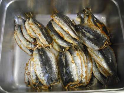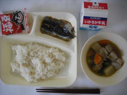 「いわしのしょうがじょうゆかけ、含め煮、いり大豆、ごはん、牛乳」