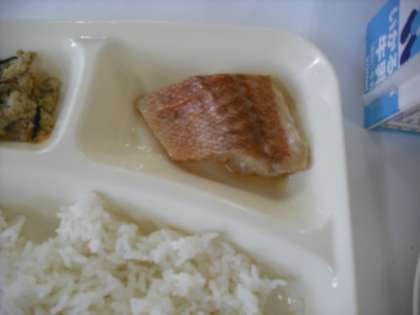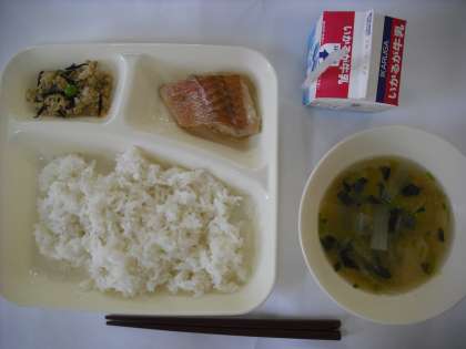 「赤魚のレモンじょうゆかけ、うすくず汁、高野どうふのいり煮、ごはん、牛乳」