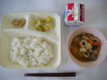 「関東煮、はくさいの甘酢づけ、白花豆の煮もの、ごはん、牛乳」