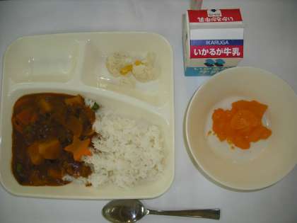 「ハヤシライス、カリフラワーとコーンのサラダ、みかん(缶)、牛乳」