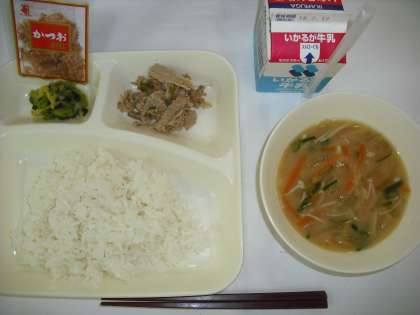 「豚肉のごまだれ焼き、みそ汁、こまつなのおひたし、ごはん、牛乳、かつお節パック」