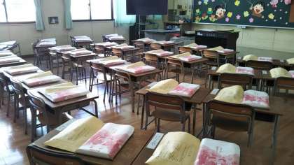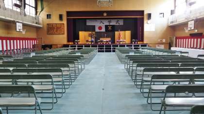 明日の入学式に備え、新6年生と教職員が心をこめて清掃と会場準備をしました。後は明日、主役の登場を待つばかりです。