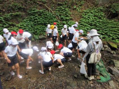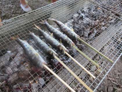 魚つかみをしました。にげまわる魚を両手でしっかりと捕まえました。捕まえた魚を、水と塩で洗い、炭火で焼いて食べました。とれたての魚は格別においしかったです。