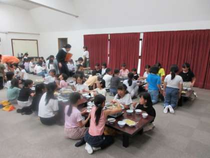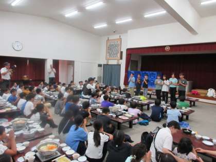 夕食でかも鍋を食べました。おいしくて、ごはんをおかわりする子どもがたくさんいました。この後は、キャンプファイヤーを行います。