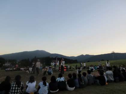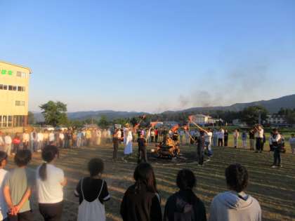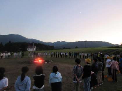 夕方になって気温が少し下がり、過ごしやすくなってきています。宿舎前の広場でキャンプファイヤーを行いました。歌って踊ったり、ゲームをしたり、楽しい時間を一緒に過ごしました。このキャンプファイヤーを楽しむために、1学期から準備をしてくれた係のみなさん、どうもありがとう。