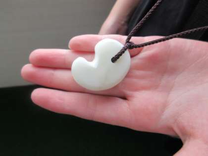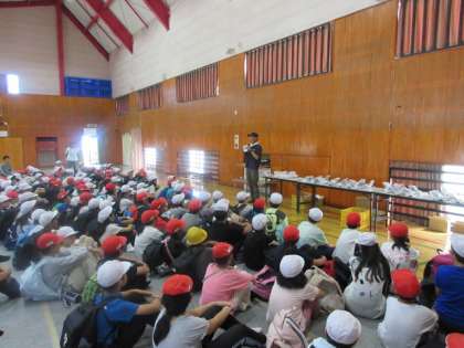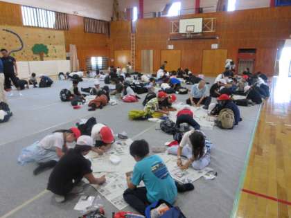体育館で勾玉作りをしました。磨きに磨きをかけ、きれいなオリジナルの勾玉をつくりました。