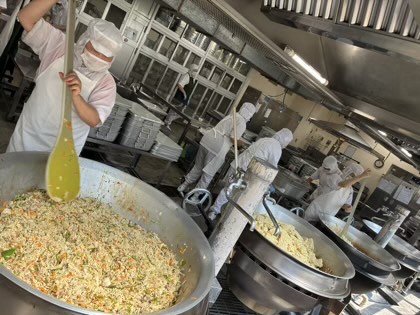 調理員さんたちが、大きなへらで混ぜてくれています。