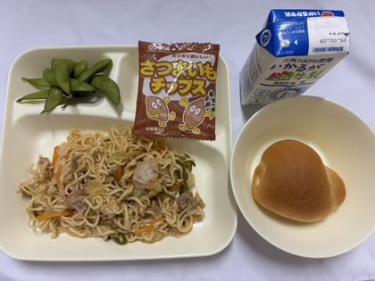 「焼きそば、えだまめ、おさつチップス、ミニコッペパン、牛乳」です。