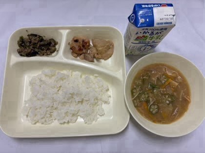 「鶏肉の照り焼き、なすのそぼろいため、とうがんのみそ汁、ごはん、牛乳」です。