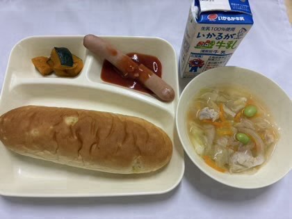 「ウインナーのケチャップソース、焼きかぼちゃ、スープ、おさつパン、牛乳」です。