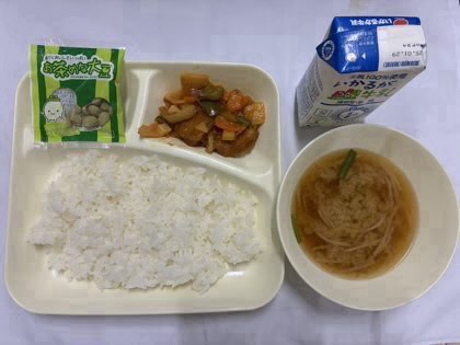 「酢豚、中華みそスープ、まっちゃ大豆、ごはん、牛乳」です。