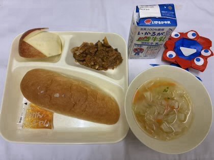 「なすのミートグラタン、鶏肉とキャベツのスープ、りんご、コッペパン、みかんジャム、牛乳」です。