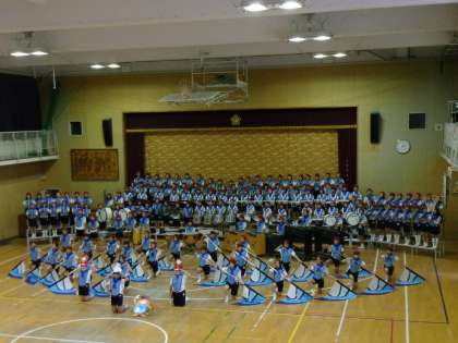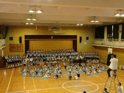 6年生は、卒業アルバムの撮影で体育館にマーチングの衣装を着て登場。