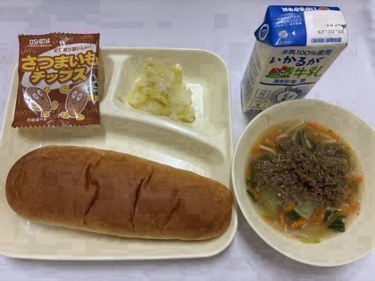 「タンタンめん、キャベツの甘酢づけ、おさつチップス、黒糖パン、牛乳」です。
