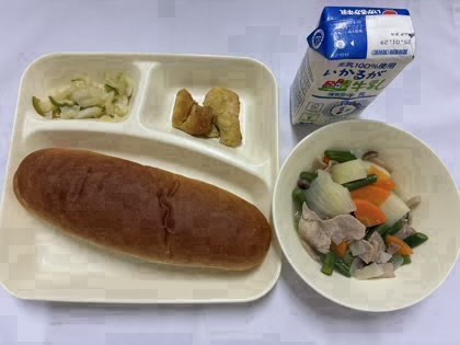 「鶏肉のカレー風味焼き、野菜ソテー、スープ煮、黒糖パン、牛乳」です。