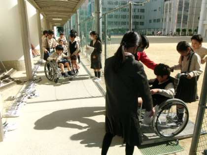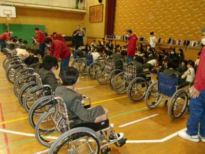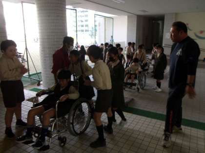 リハビリテーションセンターの方々をお招きし、4年生を対象に車椅子体験学習を行いました。