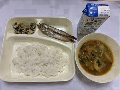 「焼きししゃも、ささみと小松菜のいためもの、和風カレー汁、ごはん、牛乳」です。