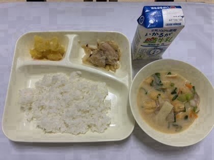 「鶏肉の塩こうじ焼き、かす汁、くりきんとん、ごはん、牛乳」です。
