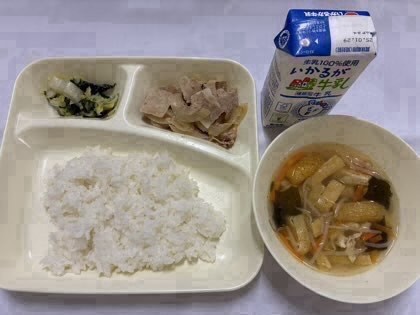 「豚肉のスタミナ焼き、菊菜と白菜のおひたし、五目汁、ごはん、牛乳」です。
