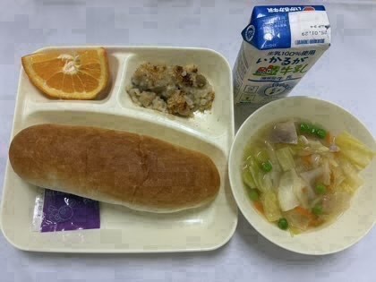 「押麦のグラタン、スープ、いよかん、コッペパン、ブルーベリージャム、牛乳」です。