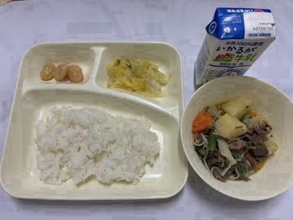 「肉じゃが、白菜のゆず風味、白花豆の煮物、ごはん、牛乳」です。