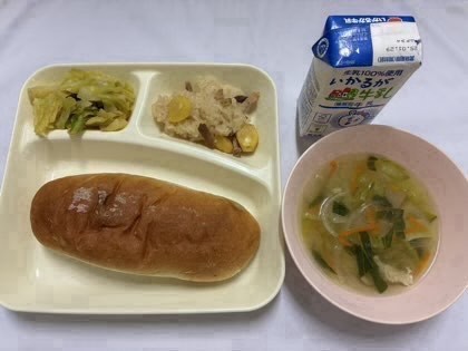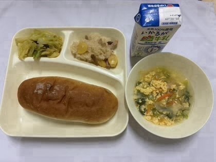 「中華おこわ、キャベツのオイスターソースいため、卵スープ、レーズンパン、牛乳」です。