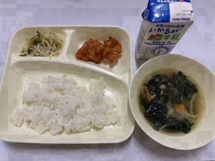 「ヤンニョムチキン、切干し大根のナムル、とうふのスープ、ごはん、牛乳」です。