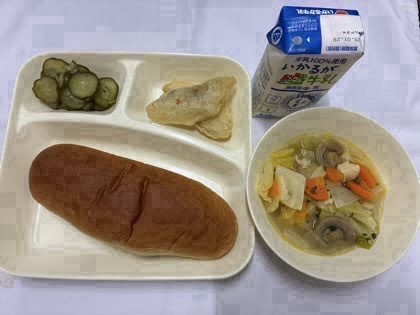 「白身魚のフリッター、きゅうりのピクルス、スープ煮、黒糖パン、牛乳」です。