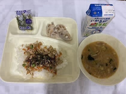 「鶏ごぼうごはん、焼きれんこん、みそ汁、ごはん、牛乳」です。