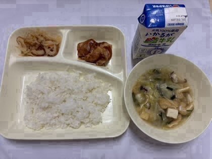「鶏肉の八丁みそだれかけ、切干大根のいため煮、五目汁、ごはん、牛乳」です。