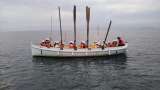 陸上で説明を受け、ライフジャケットを身に着けてカッター活動開始です。重たい櫂を協...