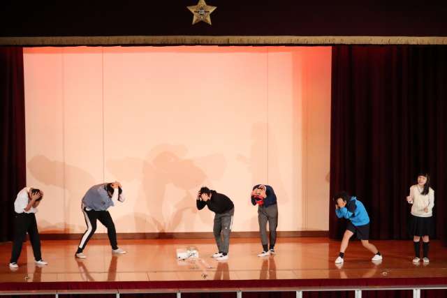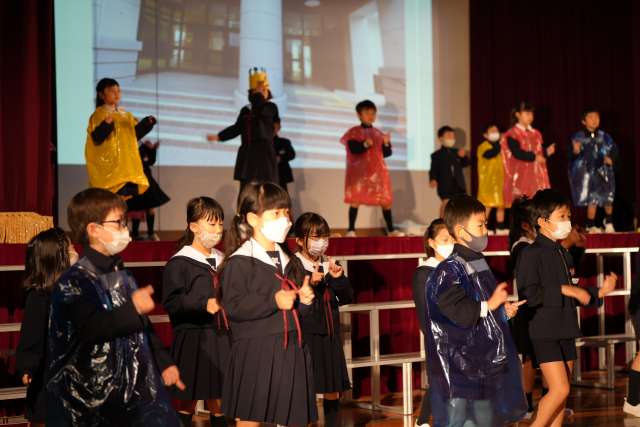 創作劇「未来は君の手に」では、人工知能ロボットに頼ろうとする未来社会の危うさを訴えかけていました。面白おかしくしかも大きな声で上手に演じていたので、1〜5年生の全員が大喜び。