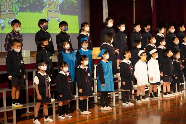 大きな体育館で初めての全校児童や保護者の前での発表です。 学校の素敵なところ を大きな声で元気いっぱい発表しました。歌「はじまりの歌」「校歌」もしっかり歌い、ダンスも一生懸命がんばりました。みんなとてもかわいかったね。