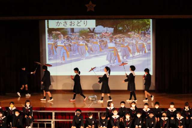 オープニングの迫力満点の群読「おまつり」が心に大きく響きました。「天神祭」の地元に住んでいて実は詳しく知らなかった子どもがほとんどです。この発表を聞いて1年生から6年生みんなが 「天神祭」についてその歴史や文化 を知ることができました。発表を通じて伝統文化の大切さや、それを受け継ぎ守っていくことの大切さを学ぶことができました。