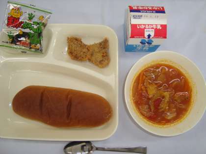 「一口トンカツ、ミネストローネ、豆こんぶ、黒糖パン、牛乳」