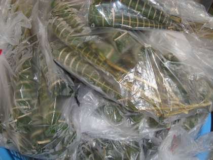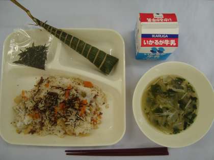 今日の給食は、こどもの日の行事献立です。ちまきがついています。ちまきは冷凍が届き、給食室で焼き物機で蒸しています。一年生の中には、初めてちまきを食べる児童もいたようです。