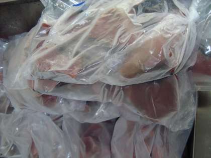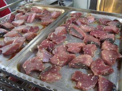 かつおは、一人分40gの1枚ものを使っています。かつおは焼くとパサパサするため、給食ではオリーブ油でからめて焼き物機(スチームオーブン)で蒸し焼きにすることでパサつき感がないように工夫しています。