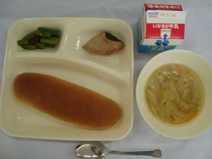 「かつおのガーリック焼き、鶏肉とじゃがいものスープ、グリーンアスパラガスのサラダ、黒糖パン、牛乳」