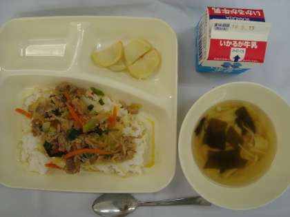 「豚丼、すまし汁、湯葉のすまし汁、焼きじゃが、ごはん、牛乳」