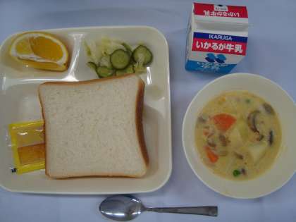 「コーンクリームシチュー、きゃべつときゅうりのサラダ、河内ばんかん、食パン、アプリコットジャム、牛乳」