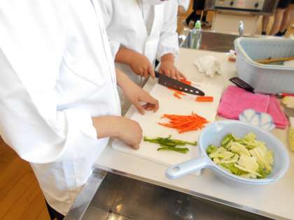 『三色野菜いため』では、にんじん・ピーマン・キャベツを短冊切りや千切りにし、炒める順番を思い出しながら調理しました。
