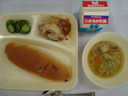 「じゃがいものミートグラタン、スープ、きゅうりのピクルス、レーズンパン、牛乳」