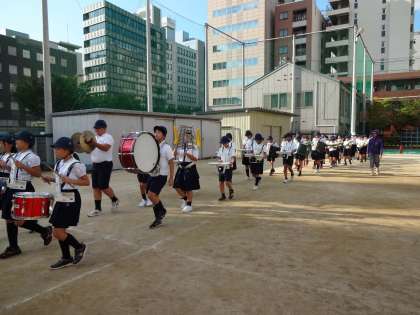 西天満小学校では、運動会の開会式・閉会式で鼓笛隊を先頭に