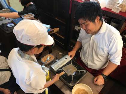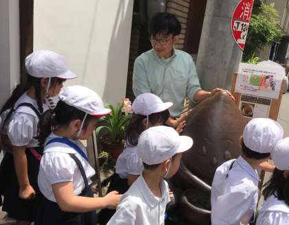 町たんけんで和田萬商店に行きました。まず、お店の方から、お店の歴史やごまのお話を聞かせていただきました。その後、実際にごまを炒ったり、擦ったりさせていただきました。こうばしい良い匂いがお店の中に広がりました。