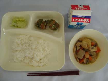 「ちくわのいそべあげ、鶏肉と一口がんもの煮もの、あっさりキャベツ、ごはん、牛乳」