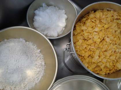 りんごのクラフティは、児童に人気がある手作りデザート献立です。りんご(缶)、小麦粉、鶏卵、生クリーム、コーンフレーク、砂糖を混ぜ合わせ焼き物機(オーブン)で焼いています。