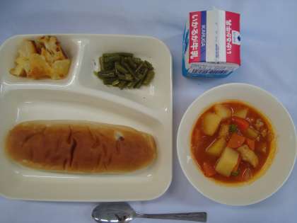 「ケチャップ煮、三度豆のソテー、りんごのクラフティ、おさつパン、牛乳」