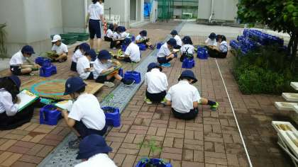 5月17日(金)に植えたミニトマトの苗が、大きく育ってきました。みんなで中庭に出て観察をし、観察カードに記録しました。背が高くなったことや茎が太くなったこと、葉の数が増えたこと、葉の感触など、子どもたちは様々な発見をしていました。次の観察の時にはどんなふうに変わっているのか、楽しみです。