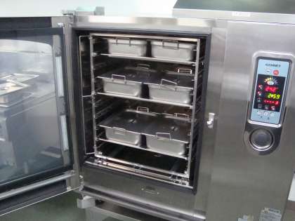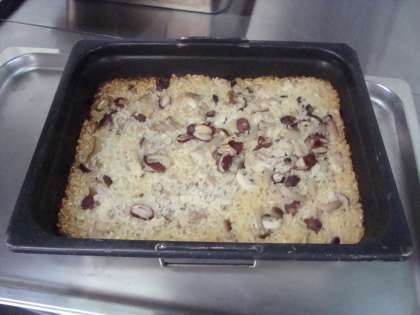 金時豆の中華おこわは、もち米に鶏肉、金時まめなどを加えて焼き物機(オーブン)で蒸し焼きして作ります。ごま油を加えることでこくが出るように工夫しています。